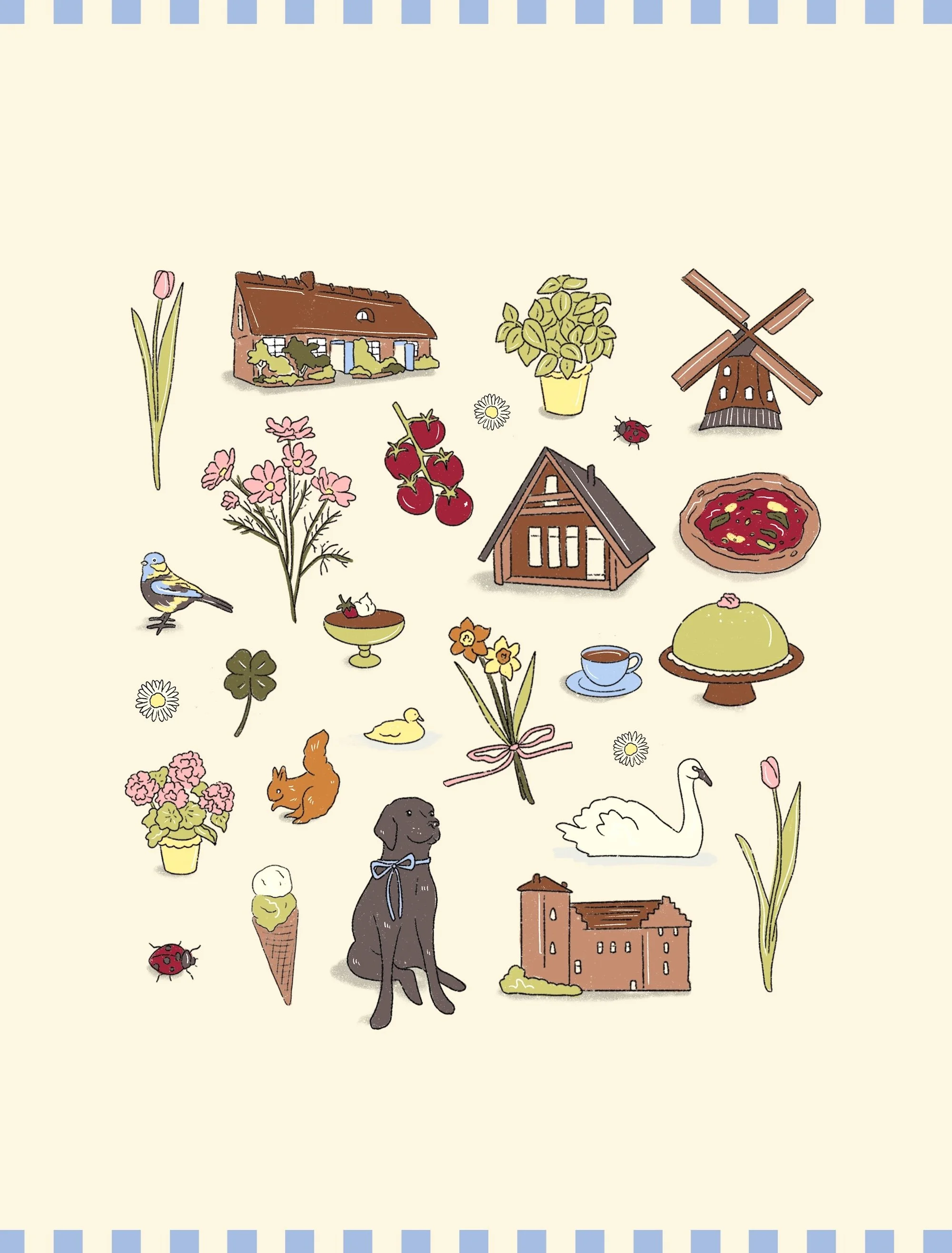 With family visiting us this spring, it seemed like the perfect opportunity to create a suite of illustrations to welcome them to Sweden. A few spring-themed patterns to use on their itinerary, and an illustration comprised of all the different icons we plan to show them or enjoy while they’re in Sweden — a night at the cabin, Prinsesstårta, pizza with fresh tomato and basil, and of course a lot of time with our best gal Saga!