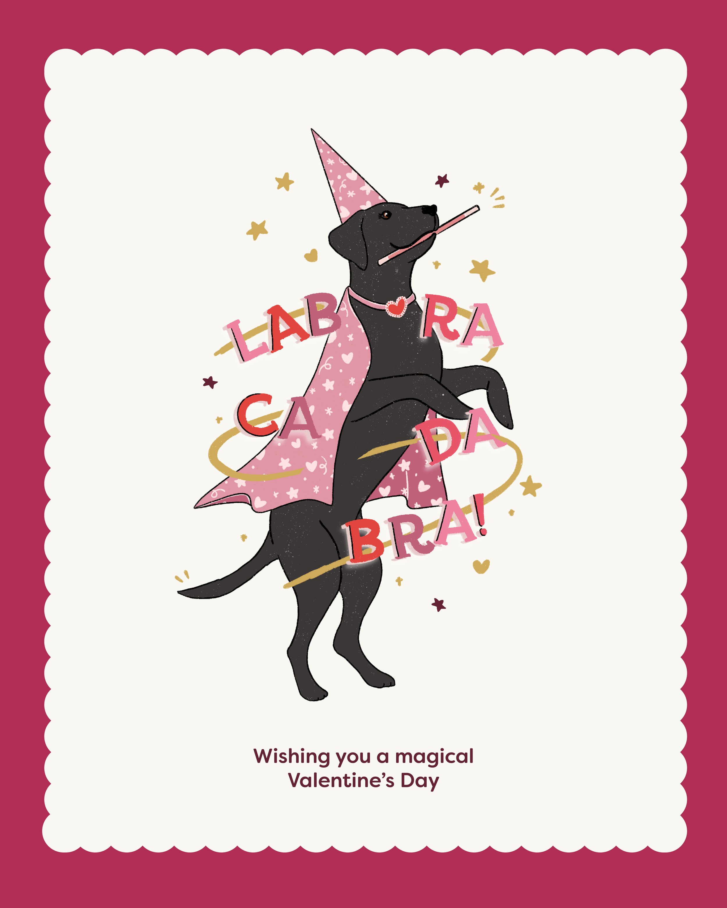 A little Labrador love for Valentine’s Day! My sweet girl Saga has been recovering from a surgery these past couple of weeks, sporting a little pink surgical suit to keep her away from the stitches on her tummy. I took inspiration from her fetching outfit for a magical, ‘Lab-racadabra!’ design to make the holiday — and I’ll be slipping a little Valentine into our neighbours mailboxes. I hope it brightens their day!