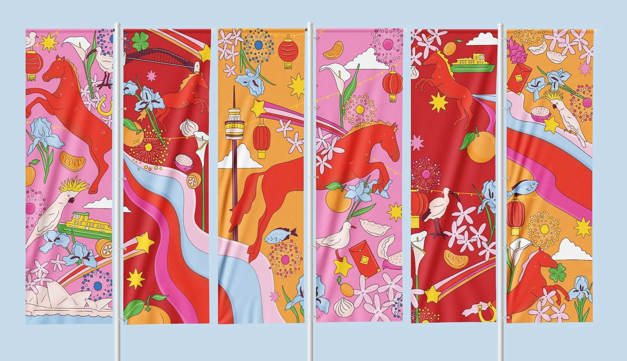 I designed a set of 6 banners that could be displayed together, alone, or in pairs — all featuring symbols of the Lunar New Year, the fire horse, and icons of the city of Sydney and the sparkling harbour in summertime.