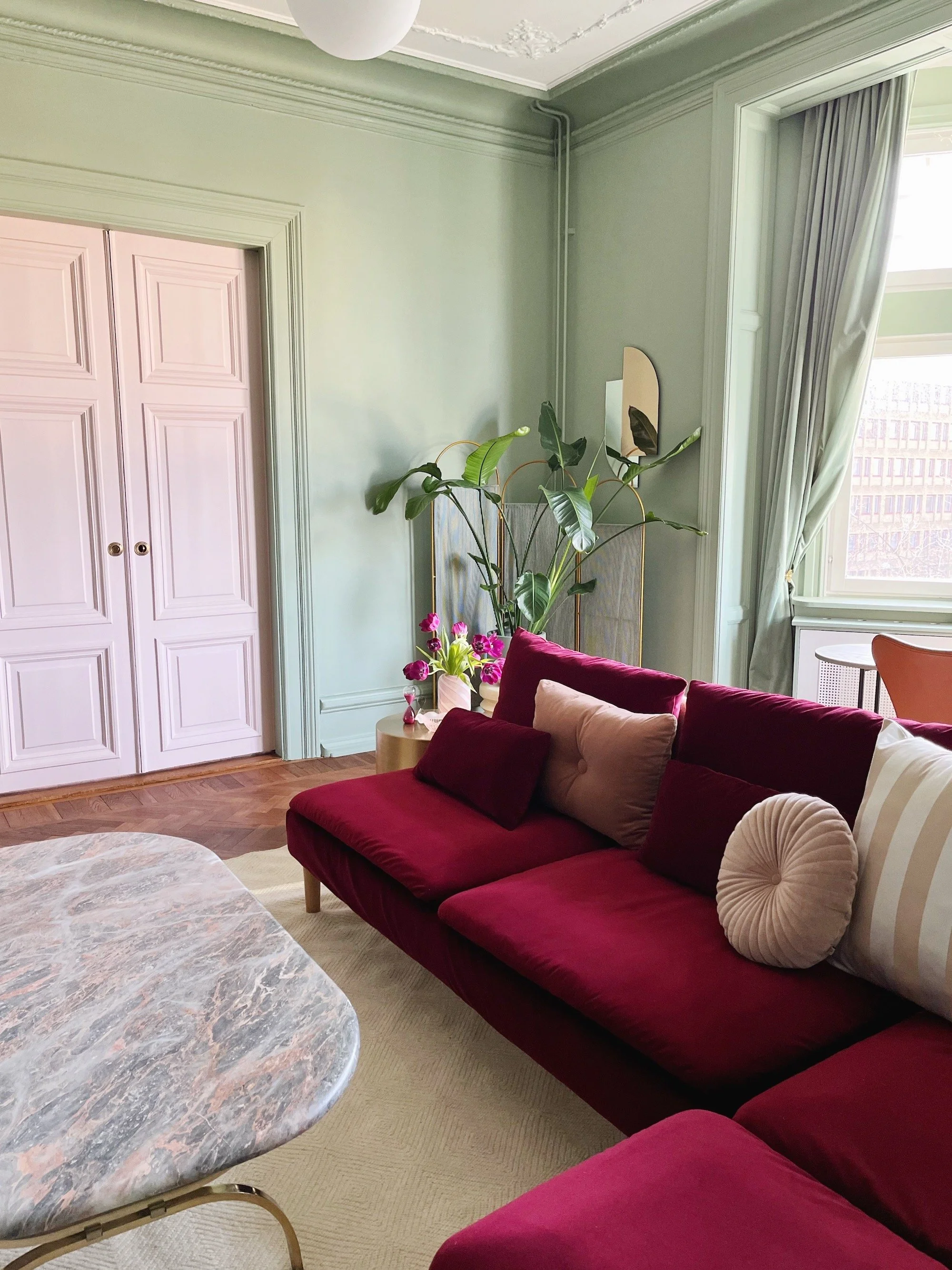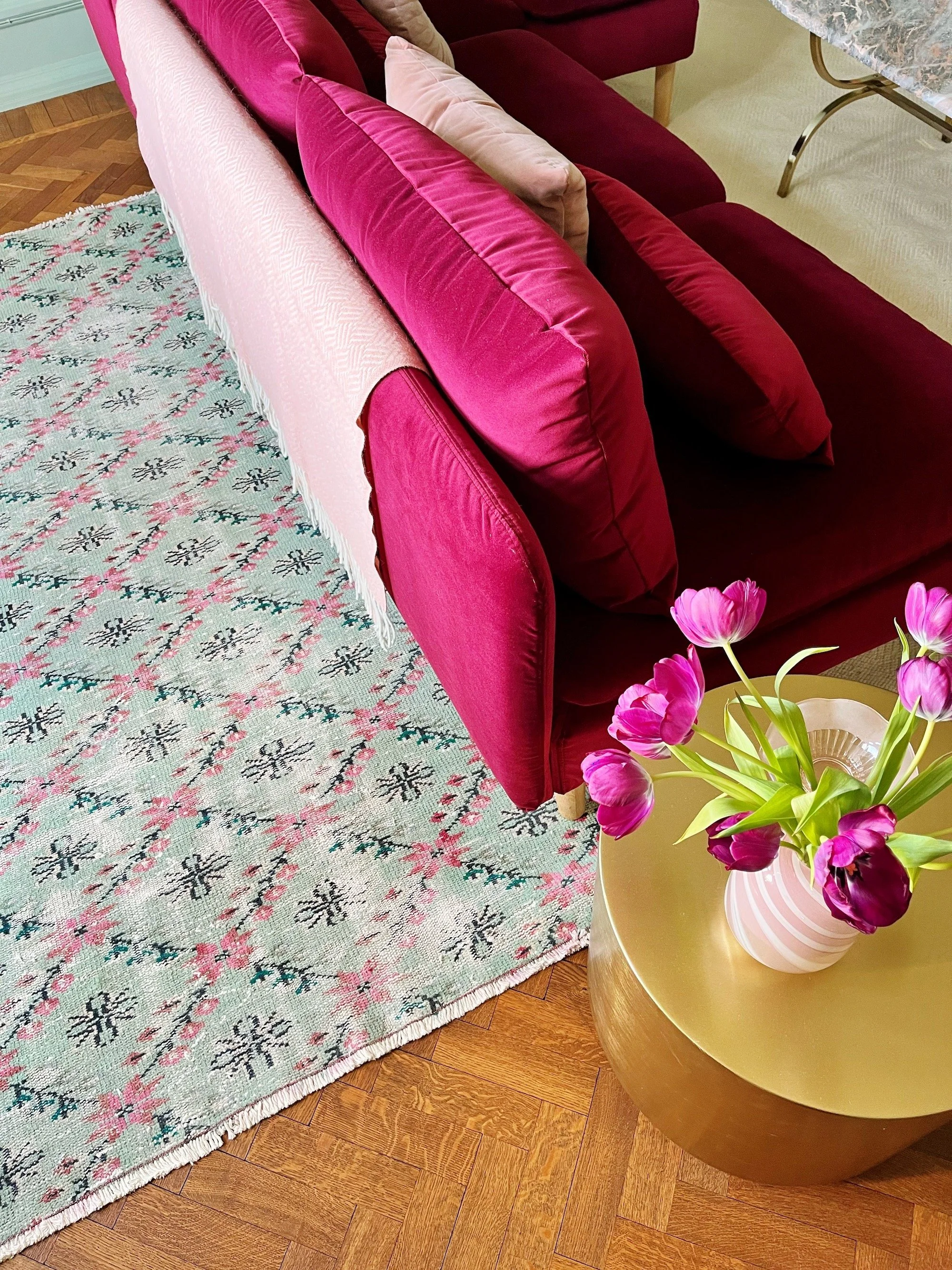 The new cover has just arrived and it feels dramatic and luxe in all the right ways. The burgundy definitely has a cerise tone to it which is really nice against the green and with the powder-pink cushions and accents in the room. It’s so fun to have another option on the sofa (and I’ll bring the pink back out in the spring), now we’re thinking we’ll dress our winter couch in the velvet and our summer version in the corduroy! Just like having a seasonal wardrobe!