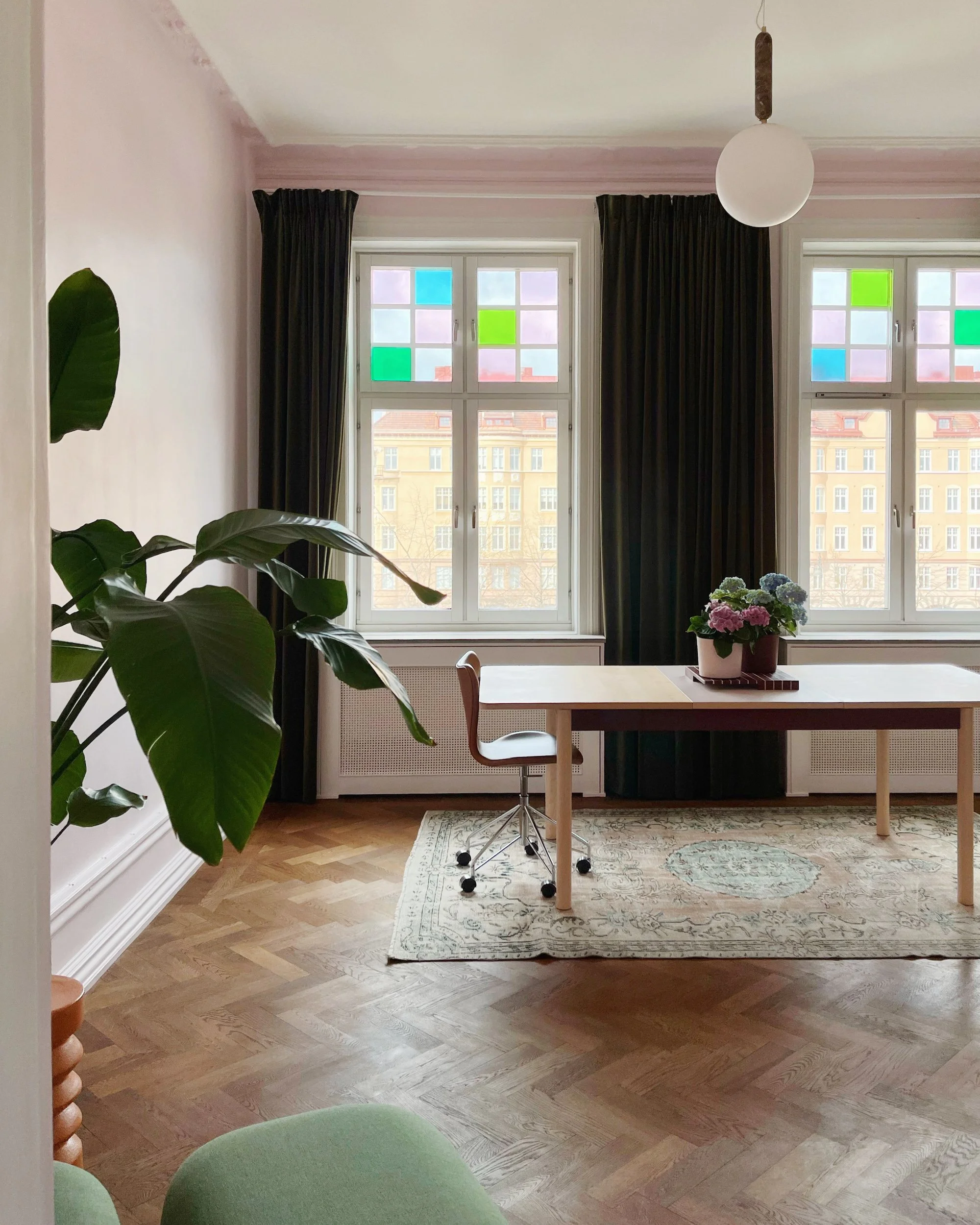 Our apartment building has beautiful stained glass in the stairwells and entryway, and I thought our studio room windows could use a little update too — after searching for almost a year, I finally found some window film online and available to be shipped to me in Sweden. Last week we did a quick DIY and installed the coloured film onto the windows; and it’s such a fun update! The colours reflect into the studio throughout the afternoon, slowly moving across the desk and floor as the sun makes its way around the building. Such an easy project and such a big boost of joyful colour!