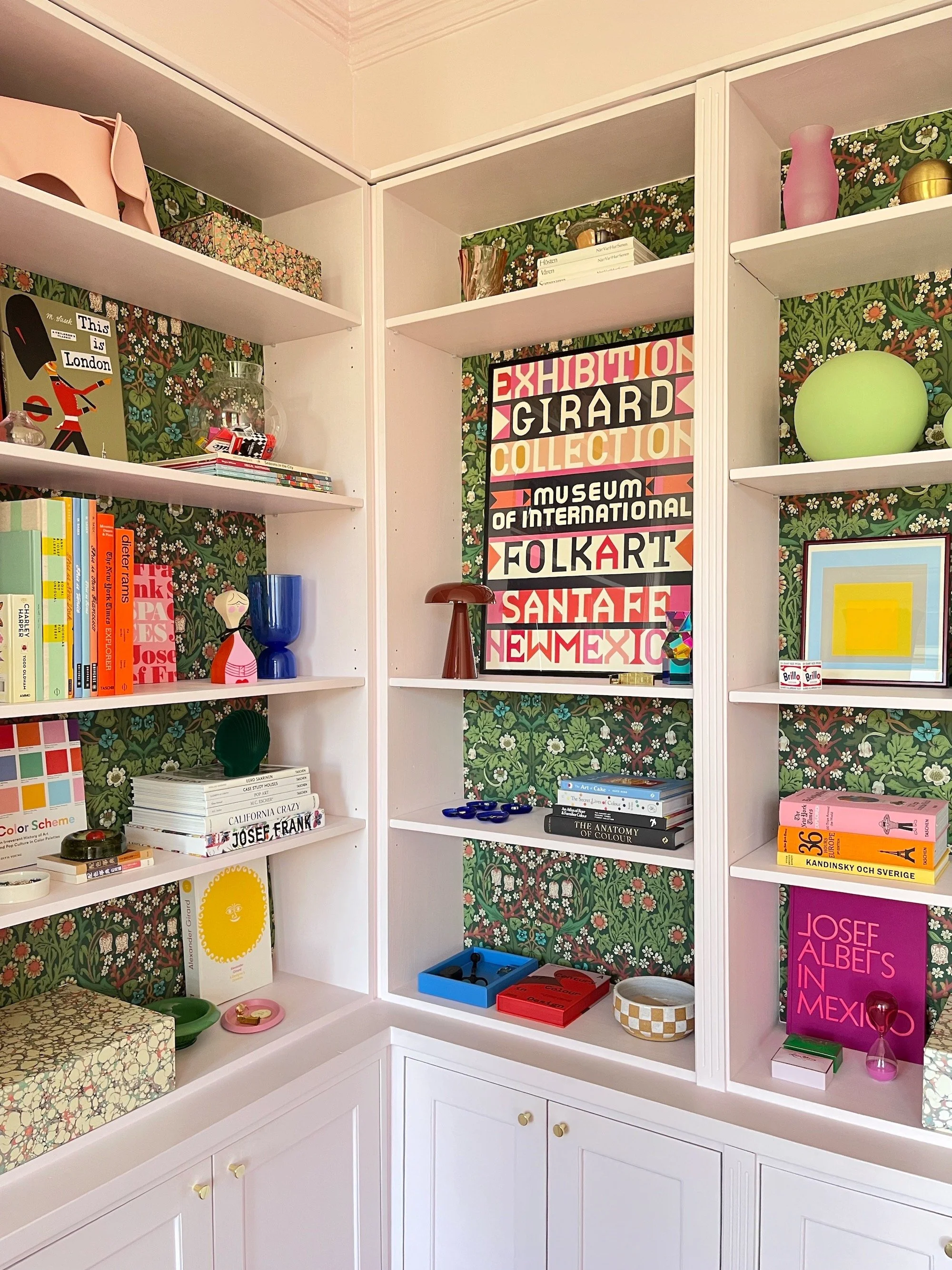 Even though our walls are long all painted and the ‘proper’ projects around the apartment are finished, I’m never one to turn down a little extra DIY — especially if it’s a short term way to give a new look or feel to a space. I’d been thinking for a few weeks about adding cut-out panels behind the shelves of the bookcase, that I could wallpaper and switch out based on the season. After giving it some more thought, it seemed like wallpaper the whole inside of the bookcase would be much more straightforward, and wouldn’t require anything extra to be purchased (such as MDF panels or foam-core sheets).