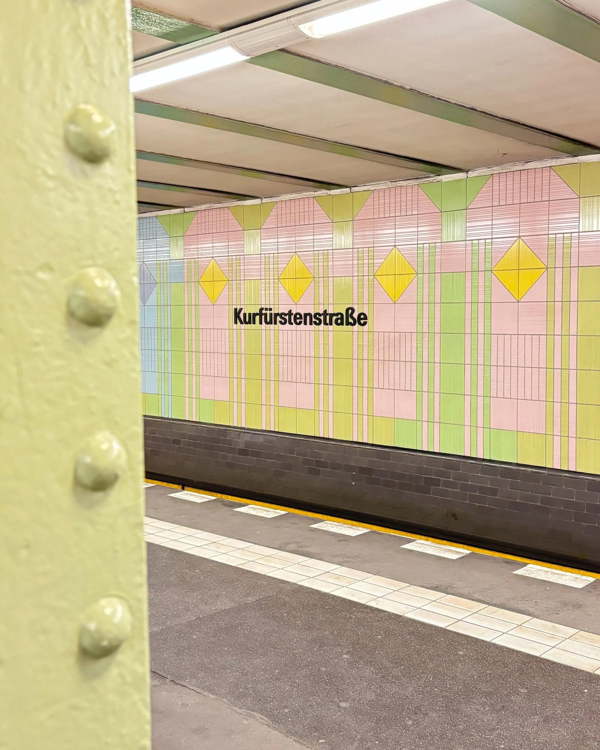 Berlin is a new top contender for the best variety; a recent visit had me stopping in my tracks to photograph the tiles and different colour combinations. The soft pinks and greens, the bright yellow and brilliant turquoise - but most curiously, the very specific hotdog red of Frankfurter Allee station… I’m trying to work out if the tiles were chosen especially for the station, or if the resemblance to a frankfurter sausage is merely a funny coincidence?